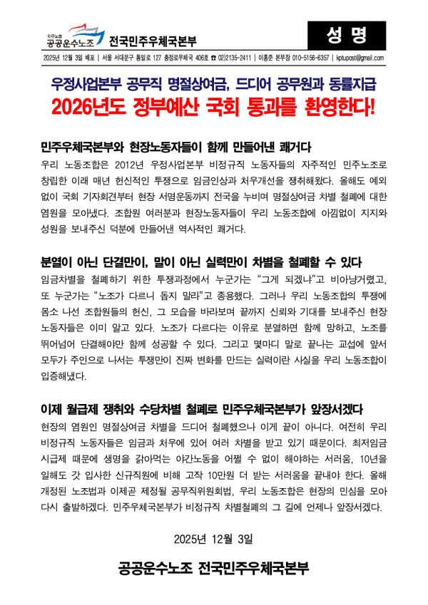[성명] 우정사업본부 공무직 명절상여금, 드디어 공무원과 동률지급 2026년도 정부예산 국회 통과를 환영한다!