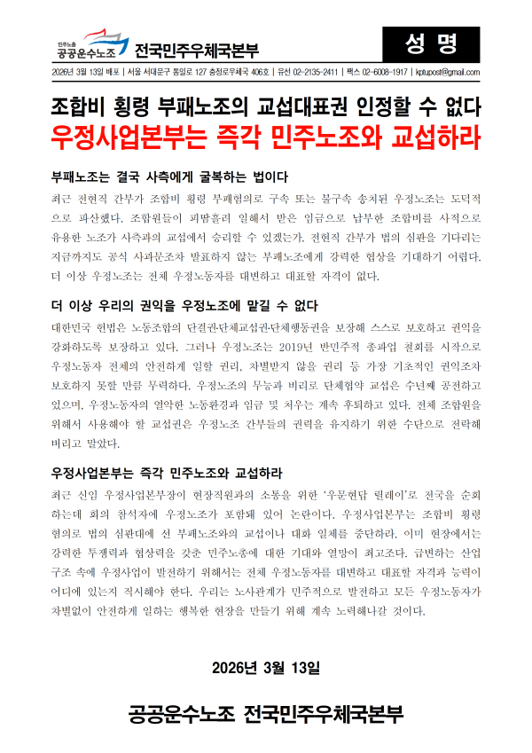 260313_성명_우정사업본부는 즉각 민주노조와 교섭하라.hwp